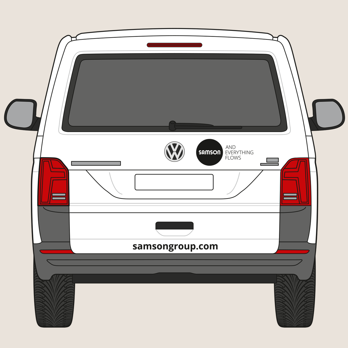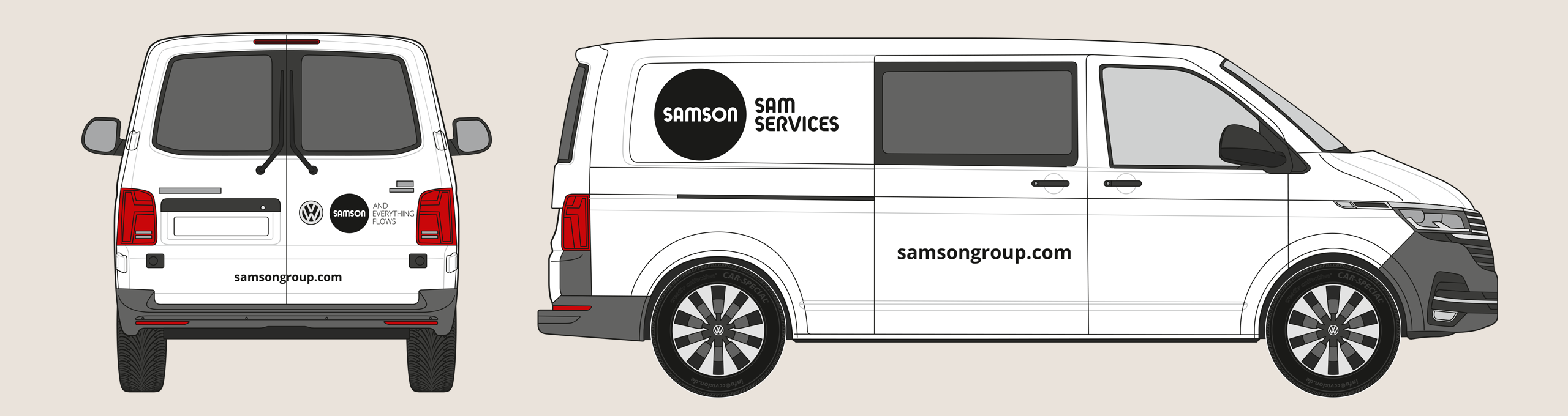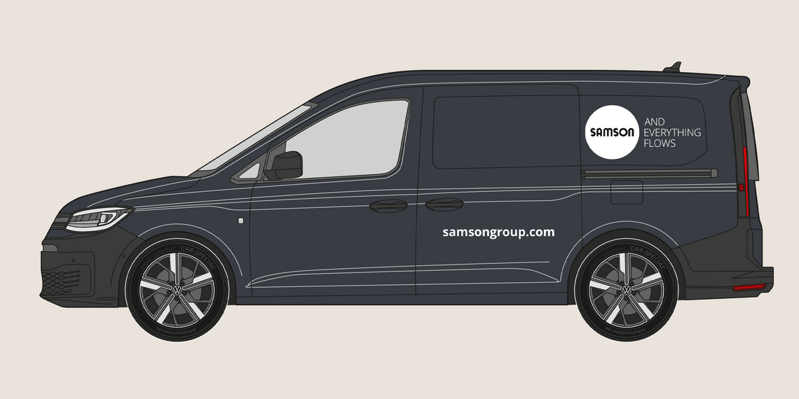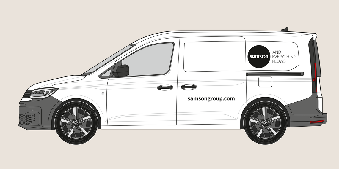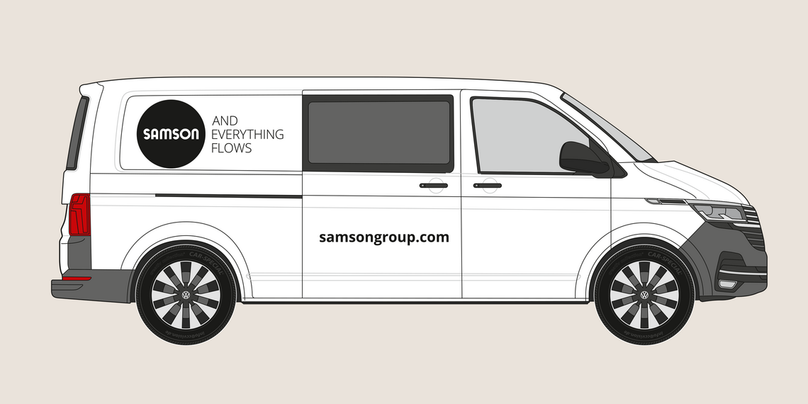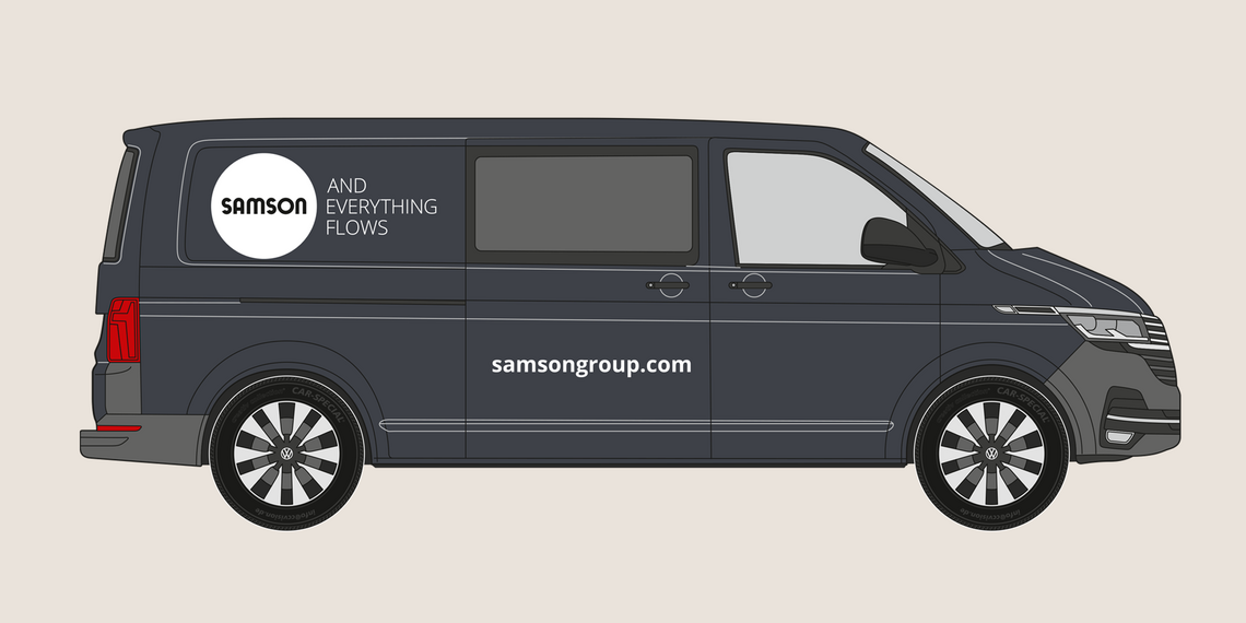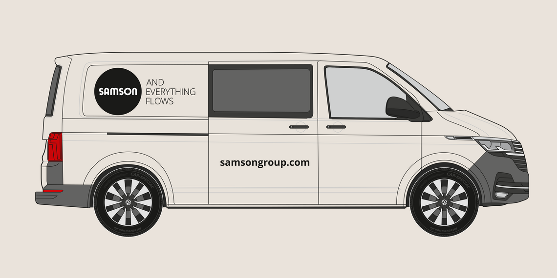 The rear of the vehicle shows the SAMSON wordmark and slogan. The website address is shown in the Open Sans Bold font. The precise placement depends on the specific vehicle type, but the logo’s surrounding space must be maintained.