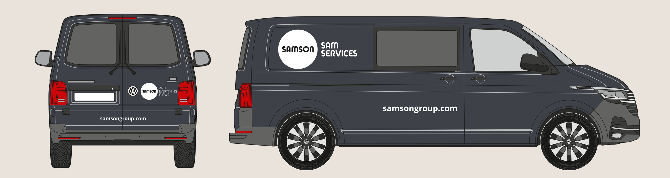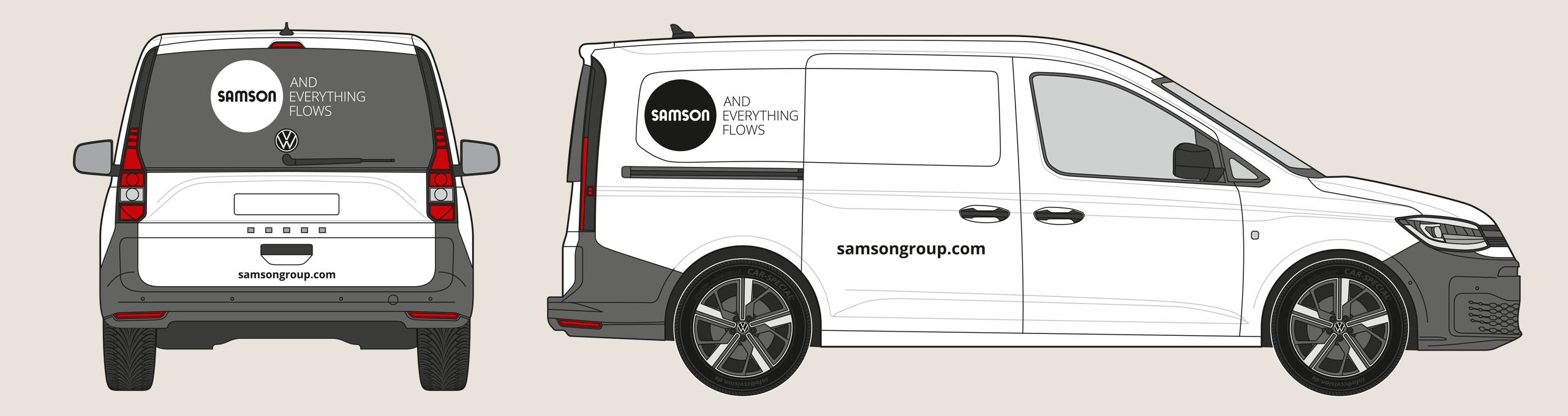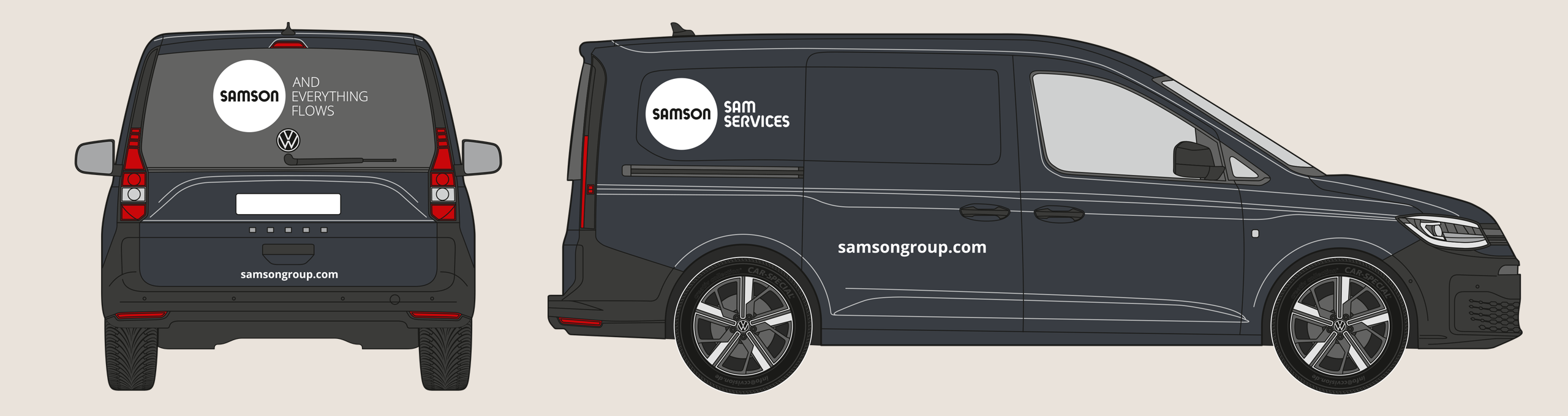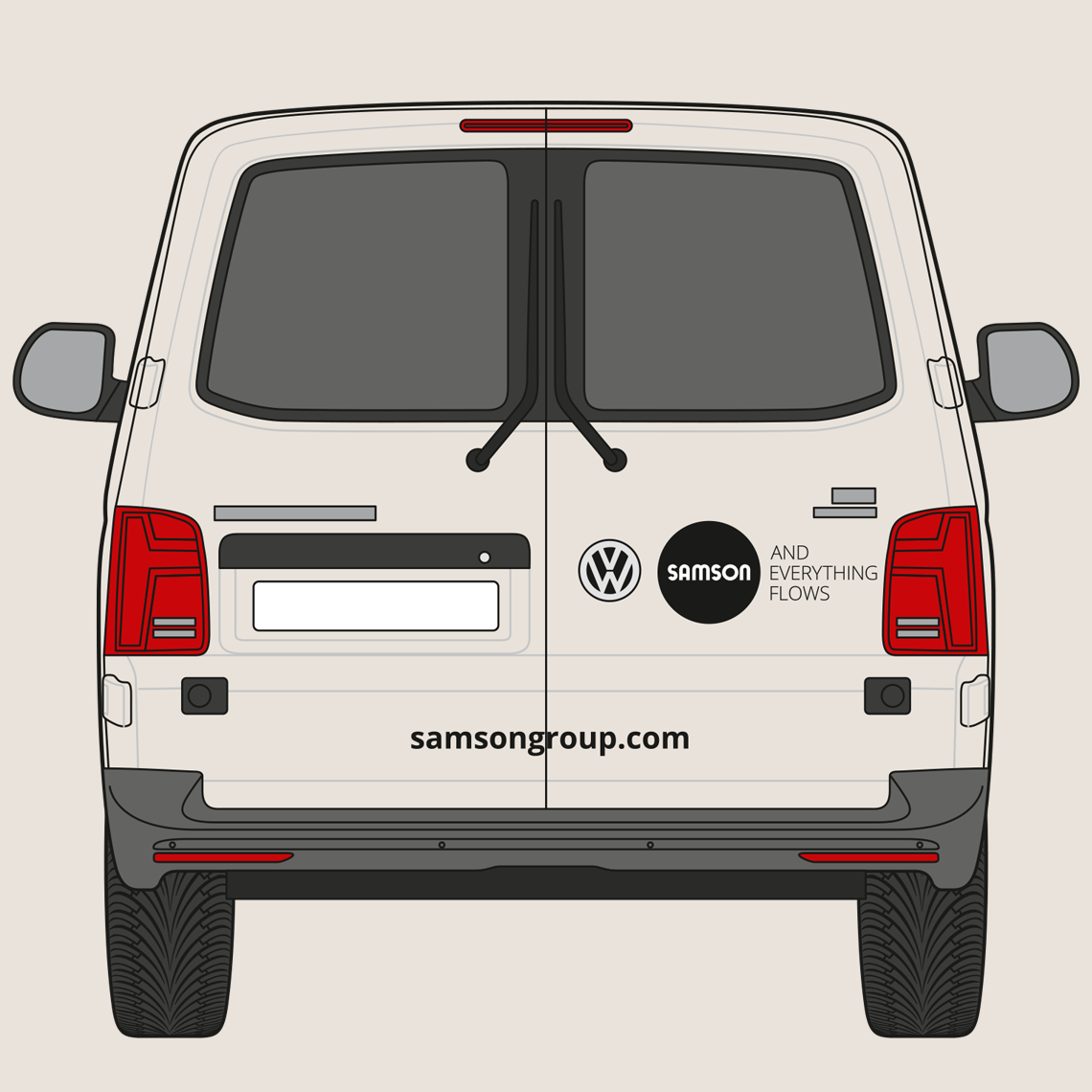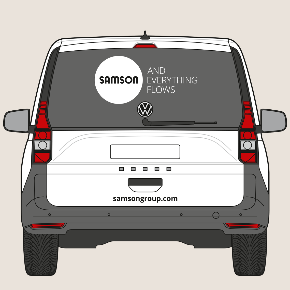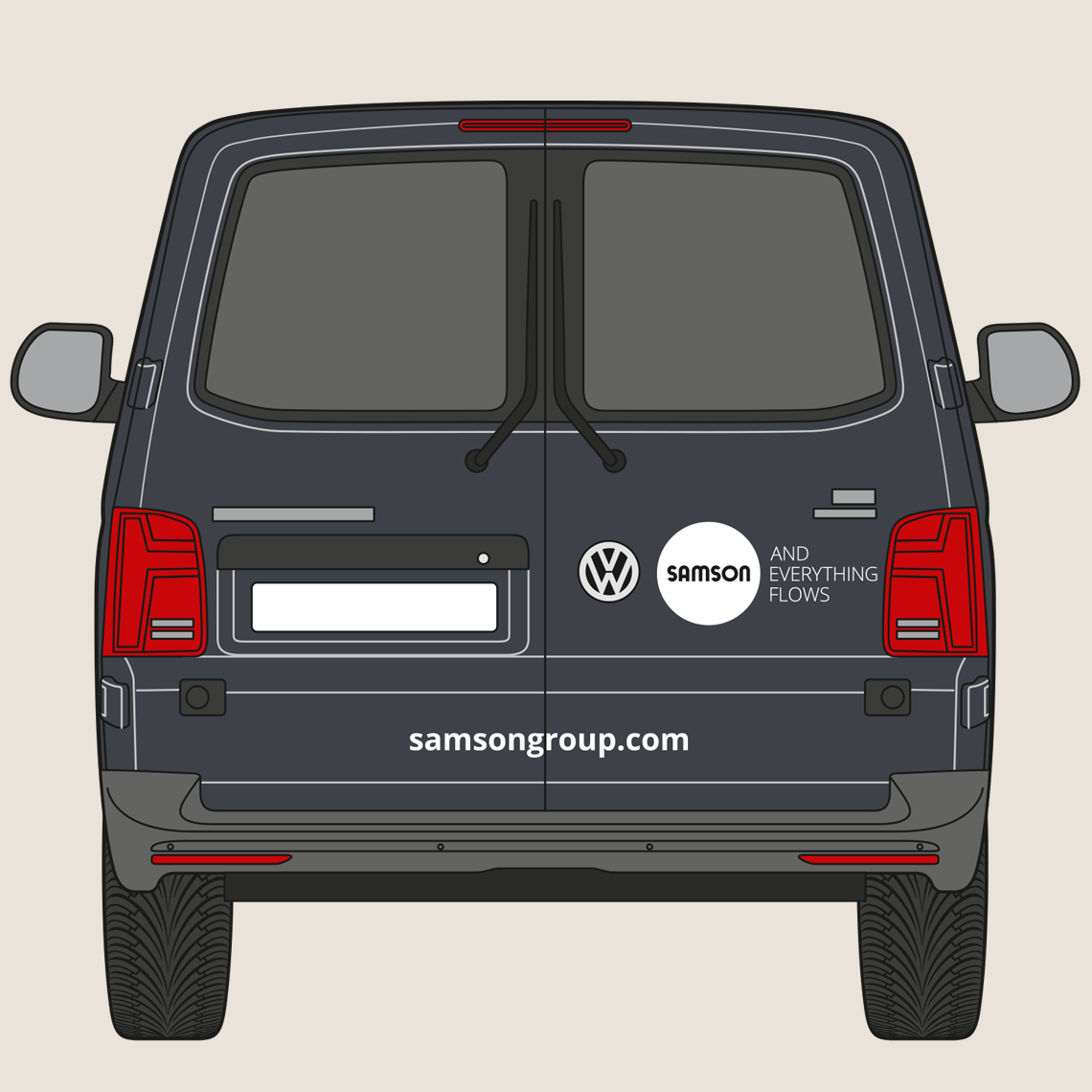 The rear of the vehicle shows the SAMSON wordmark and slogan. The website address is shown in the Open Sans Bold font. The precise placement depends on the specific vehicle type, but the logo’s surrounding space must be maintained.