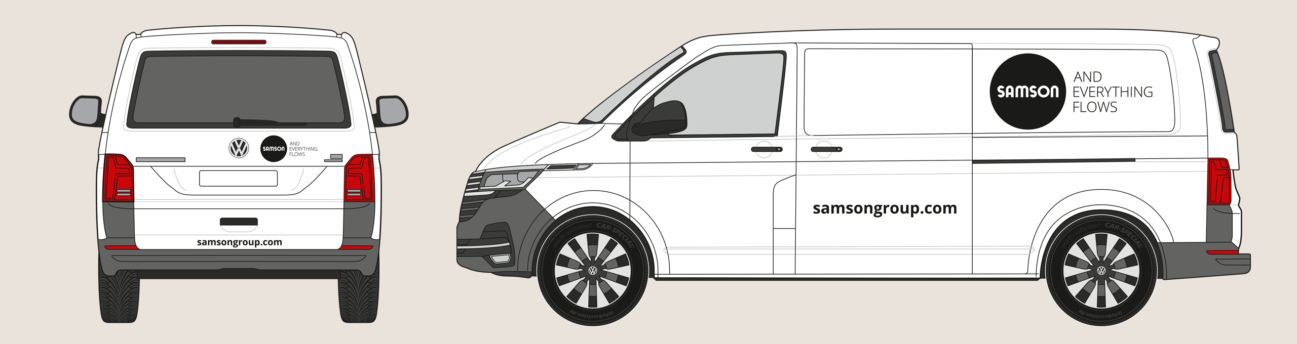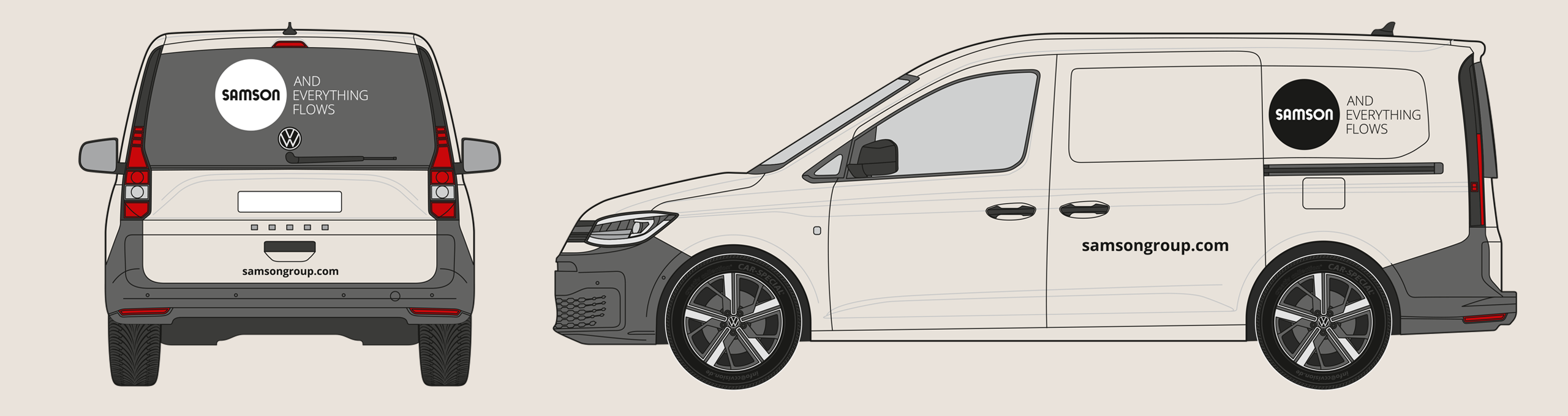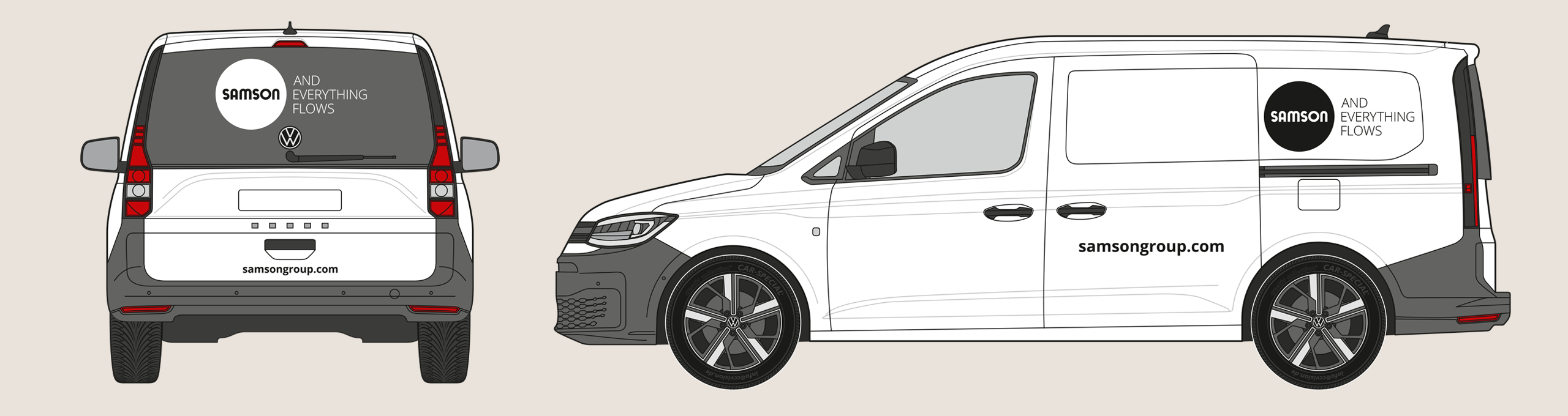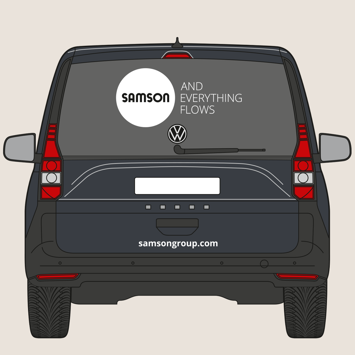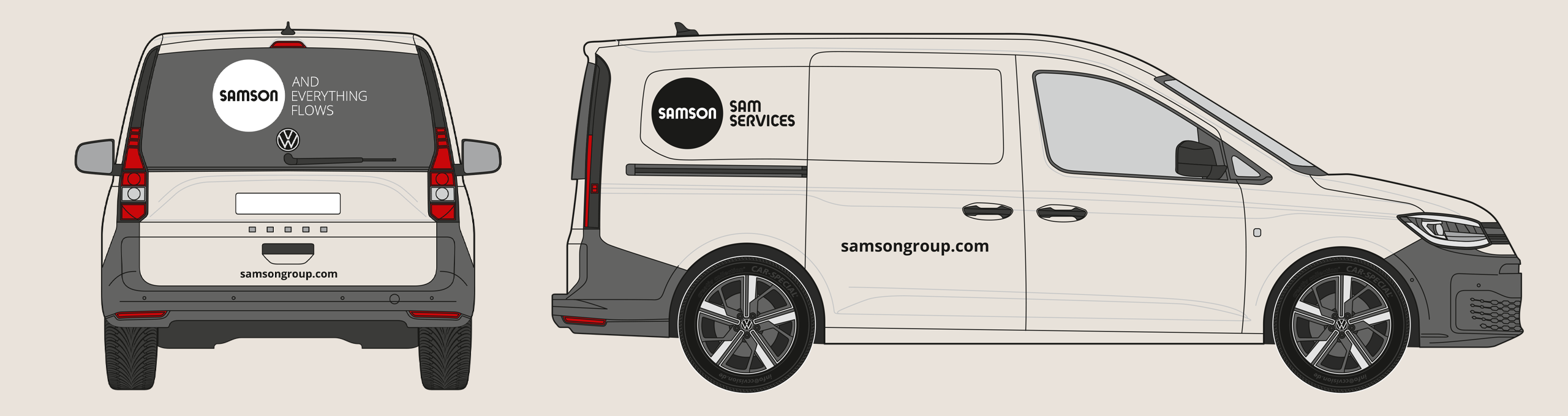 The rear of the vehicle shows the SAMSON wordmark and slogan. The website address is shown in the Open Sans Bold font. The precise placement depends on the specific vehicle type, but the logo’s surrounding space must be maintained.
