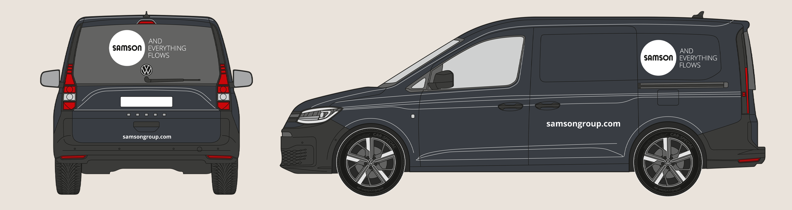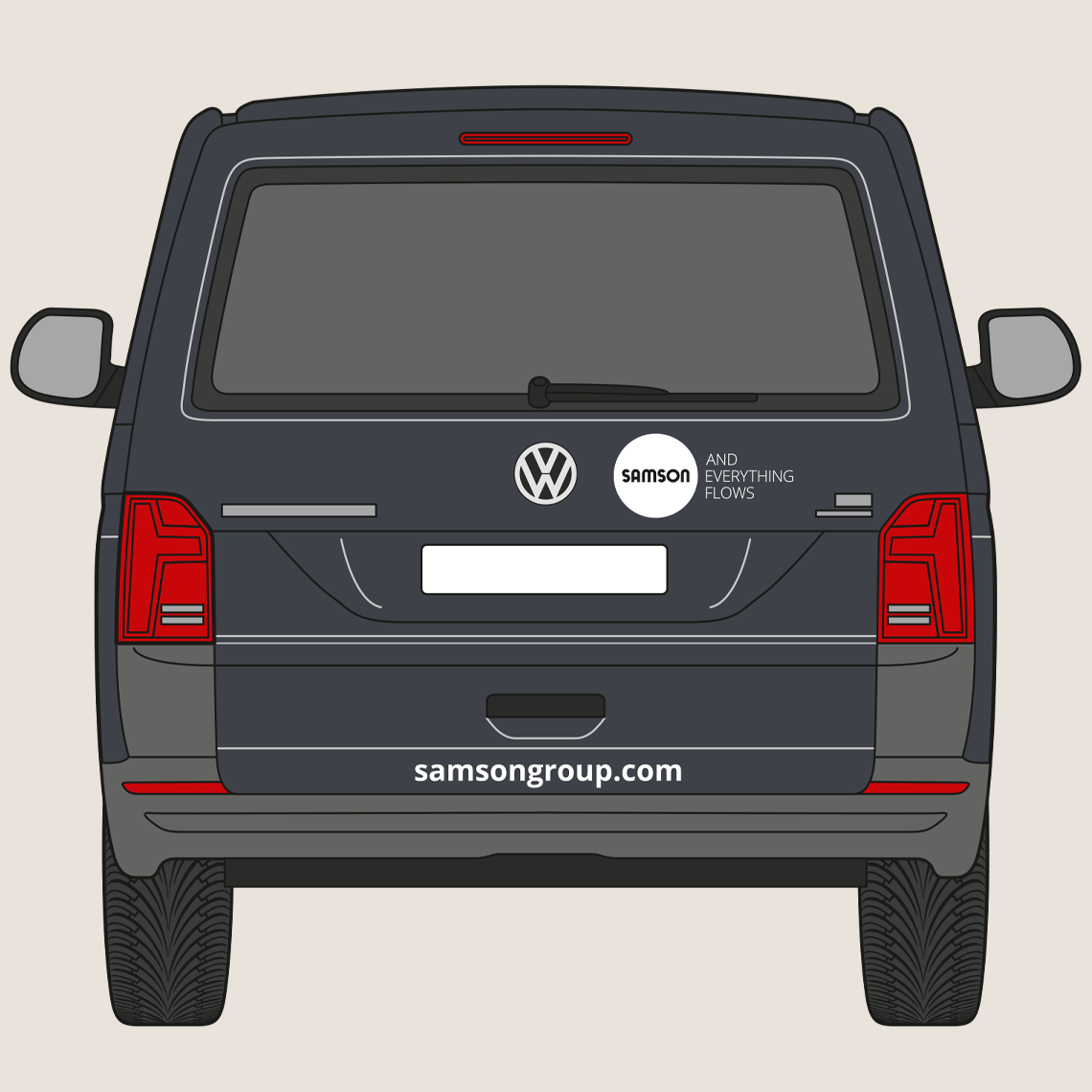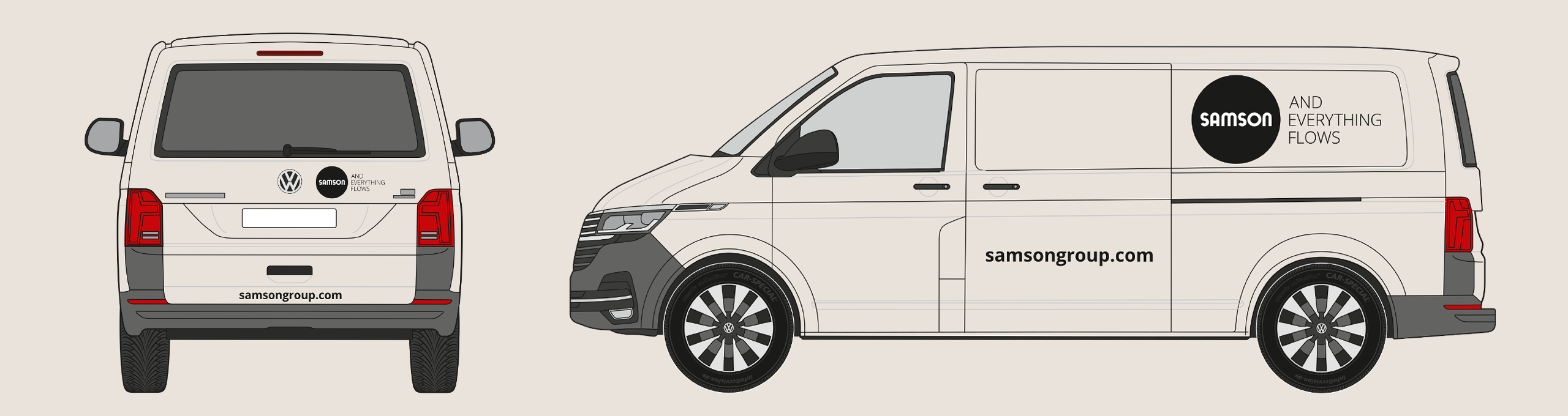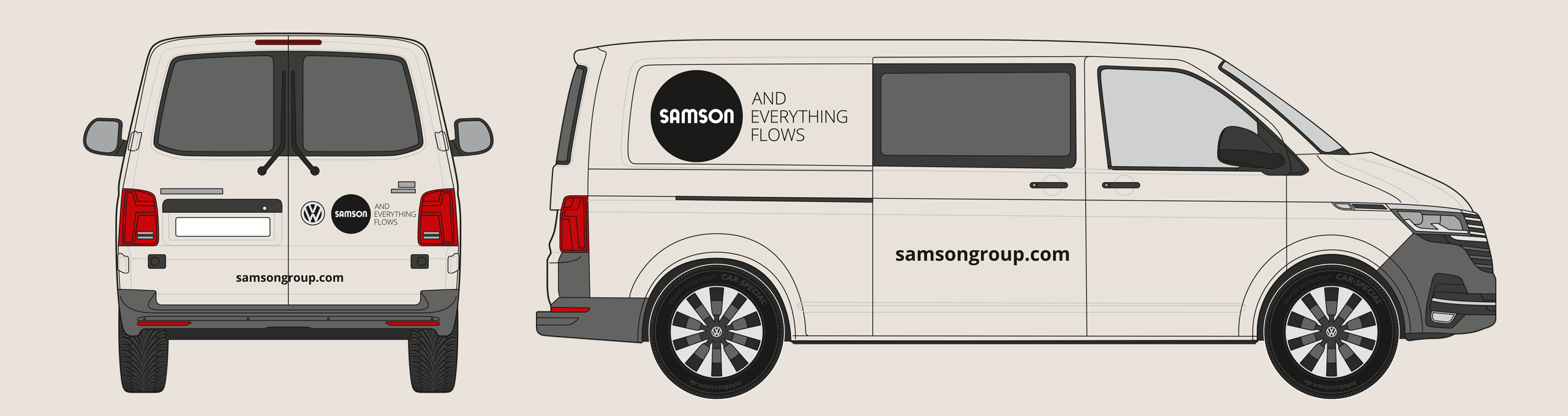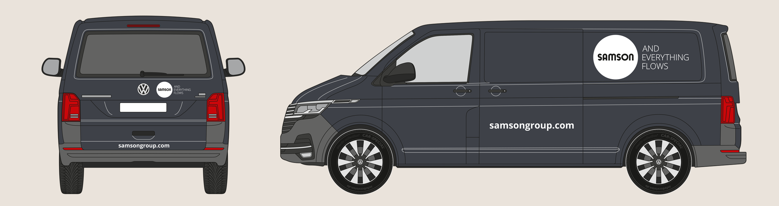The rear of the vehicle shows the SAMSON wordmark and slogan. The website address is shown in the Open Sans Bold font. The precise placement depends on the specific vehicle type, but the logo’s surrounding space must be maintained.